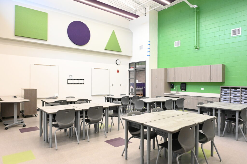 The design reflects the district’s commitment to inclusion and belonging. DeKalb’s SOAL (Specialized Opportunities for Academic and Life Skills) program is intentionally integrated within the same wings as general education classrooms, ensuring all students learn and grow together. Additional amenities include a gymnasium that doubles as a storm shelter, music room, community garden, and ample outdoor spaces for recreation and play.