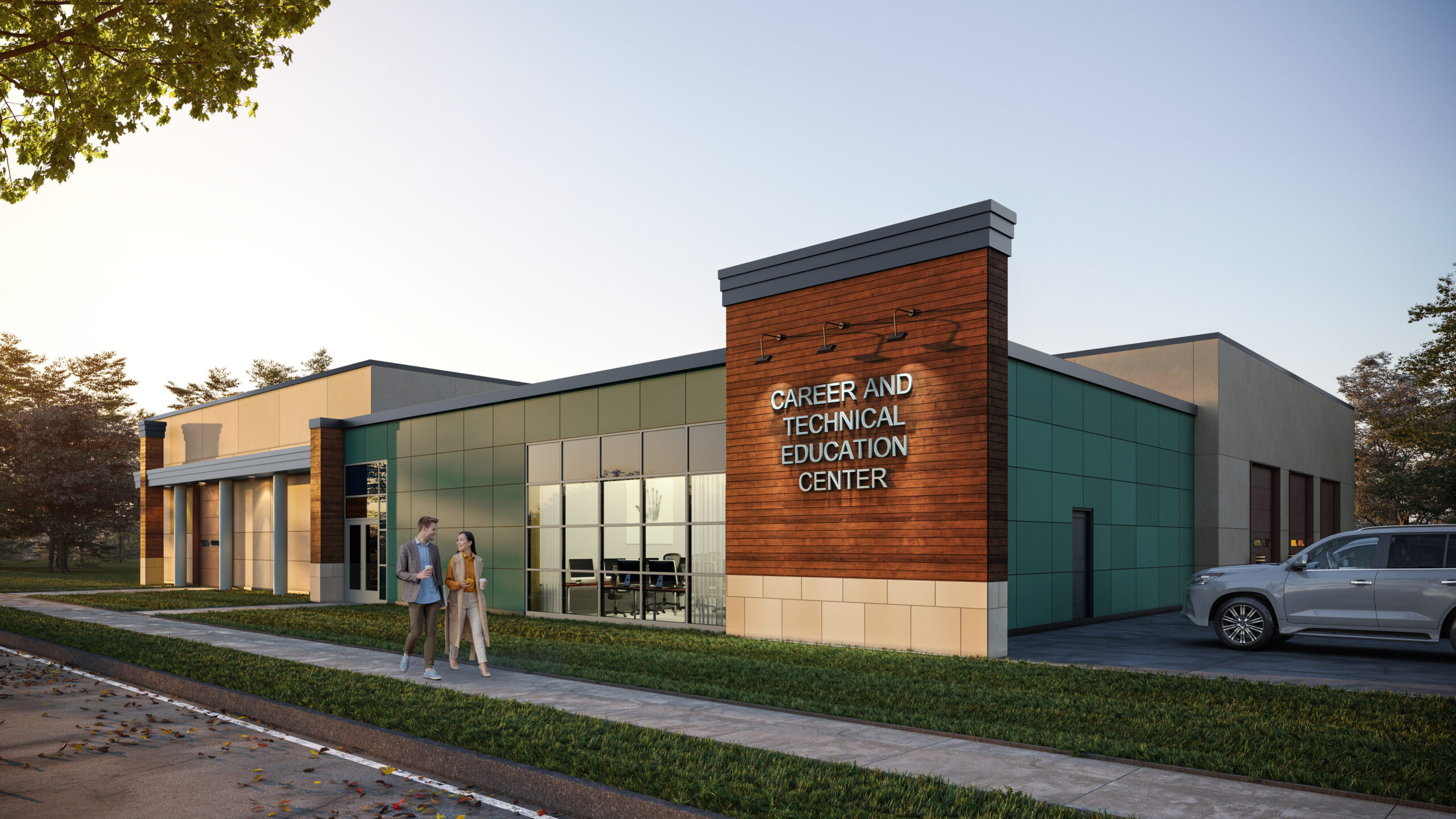 The standalone facility accommodates 45 students and three teachers — a 33% increase from the district’s previous vocational spaces — and features dedicated areas for automotive, metals, and woods/building trades instruction.